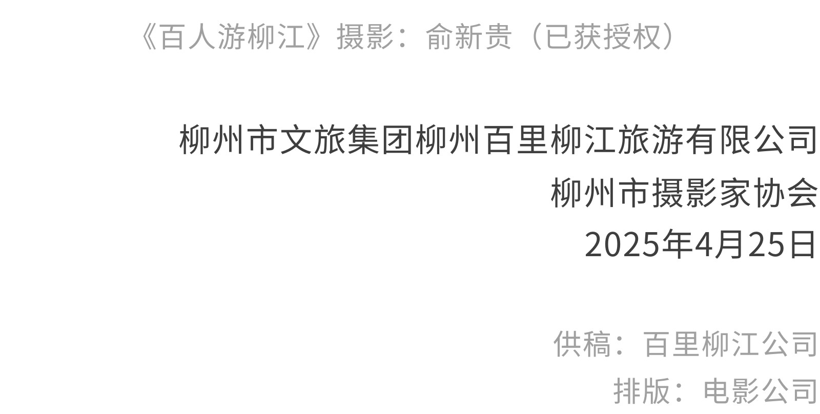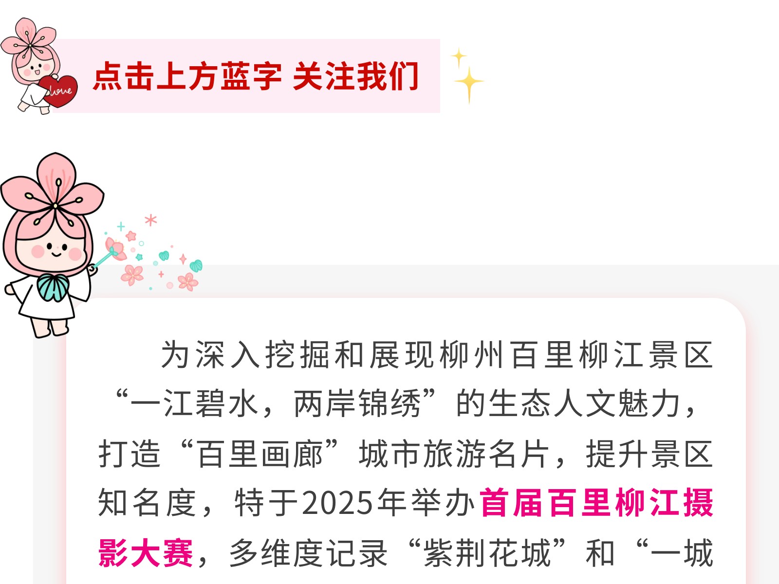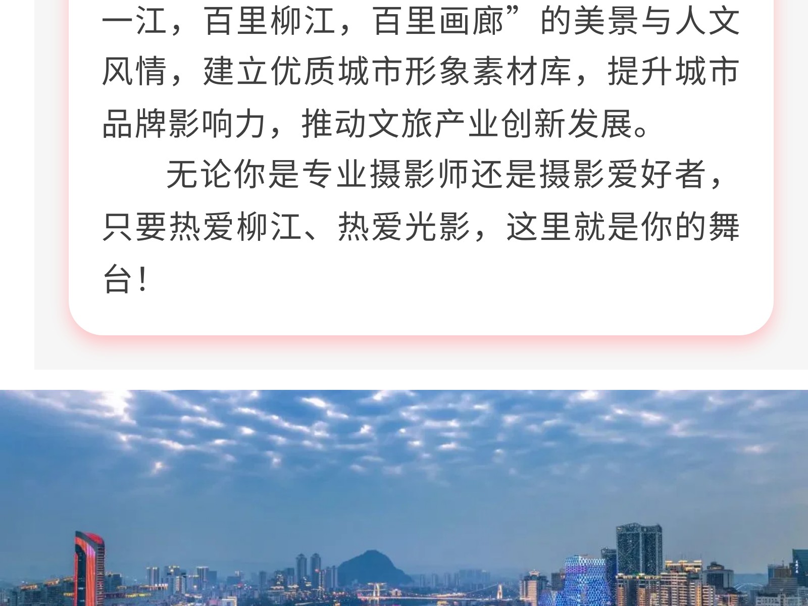定格最美柳江!首屆“百里柳江”攝影大賽火熱征集中,邀你共賞百里畫廊! 發(fā)布時間:2025年04月26日 16時來源:本站原創(chuàng)瀏覽:48 人次